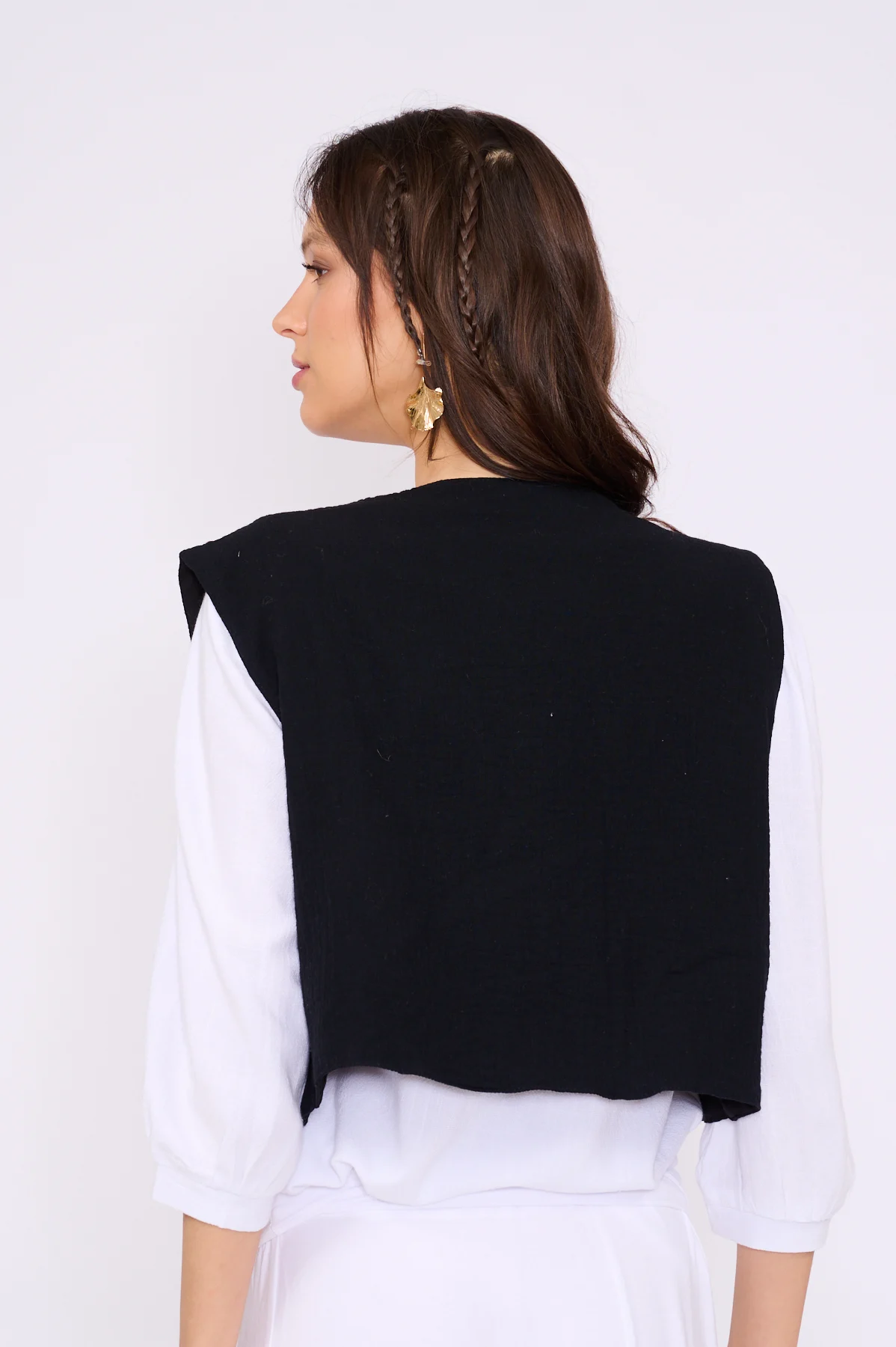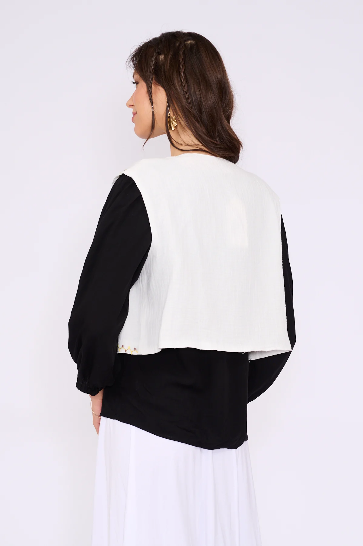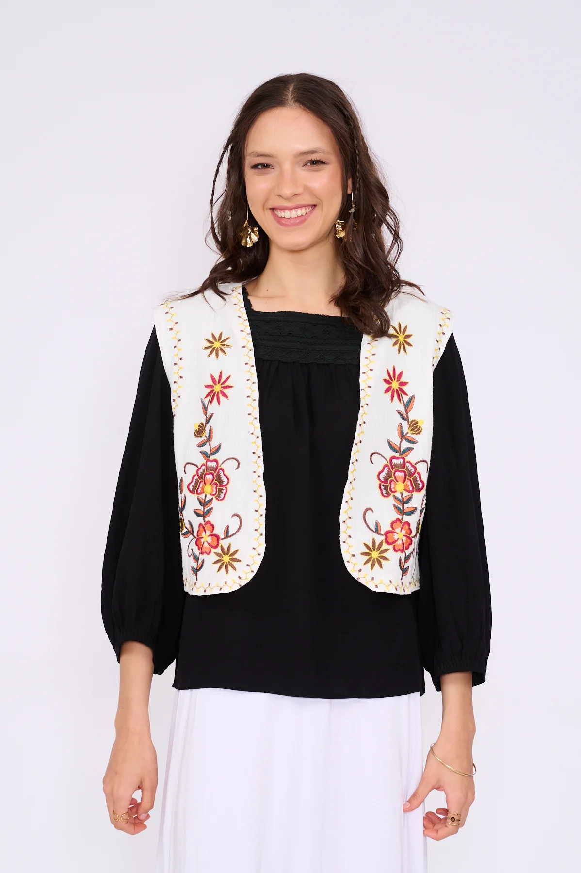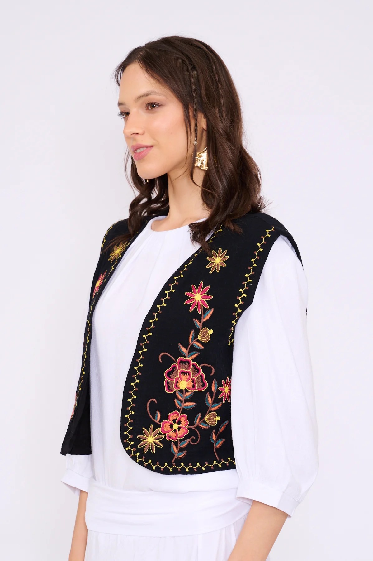 ווסט רקום שמוסיף המון צבע וחיות לכל לוק פשוט. הוא עשוי מבד נעים עם רקמת פרחים עשירה וצבעונית בחזית, וסיומת של תפרים צהובים עדינים לאורך הקצוות שנותנים לו מסגרת יפה ומדויקת. הוא יושב מעולה מעל חולצה או שמלה ונותן טאץ’ רומנטי וצנוע כהלכה