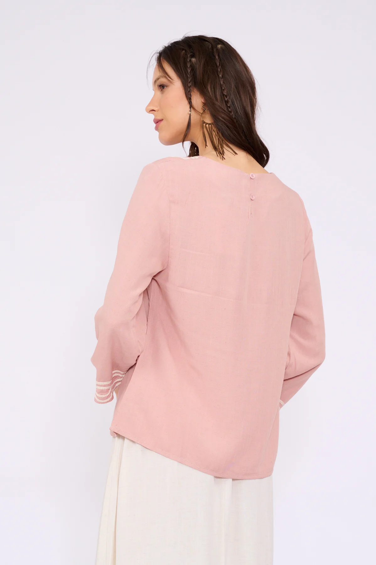 חולצה נינוחה ומלאה בפרטים שנותנים לה מראה מיוחד ומושקע. יש לה צווארון עגול וצנוע שמעוטר ברקמה עשירה ובהירה, שחוזרת גם בסיומת של השרוולים הארוכים. הבד קליל ונעים על הגוף, והגזרה משוחררת ומחמיאה שמשתלבת נהדר עם כל חצאית.