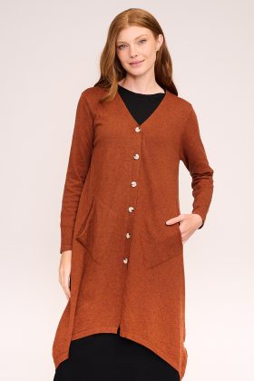 עשוי בד רך ונעים בגזרה ארוכה ומשוחררת עם מפתח V עדין וכיסים קדמיים.