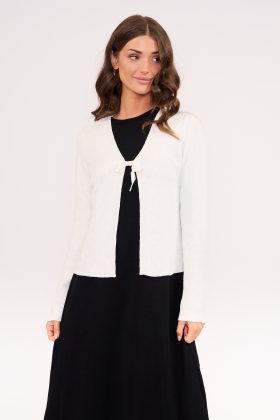 סריג קליל ונעים בגזרת קרדיגן קצר, עם קשירה עדינה בחזה ומרקם סריג ריב סרוג צפוף שמחמיא לגוף.