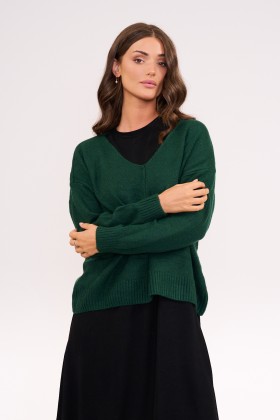 סריג רך ונעים בגזרה רחבה ומשוחררת, עם מפתח V מחמיא ותפר קדמי עדין שמוסיף עניין וסטייל.