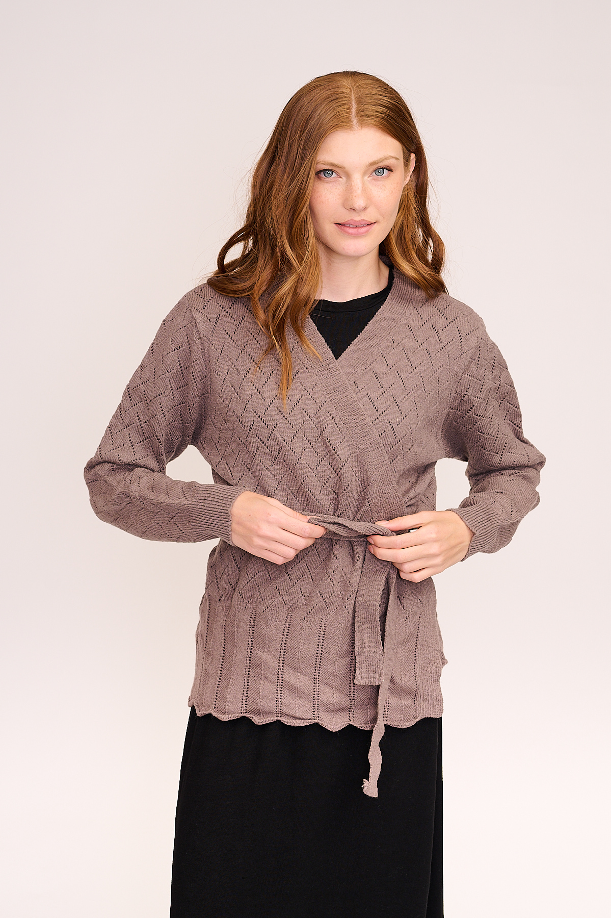 הסריג מעוטר בדוגמת סריגה עדינה ומרקם מחמיא שמעניק מראה אלגנטי ומסודר.