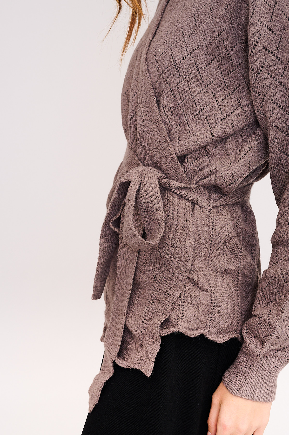 סריג רך ומעודן בגזרת מעטפת נשית עם חגורת קשירה במותן להדגשת הגזרה.