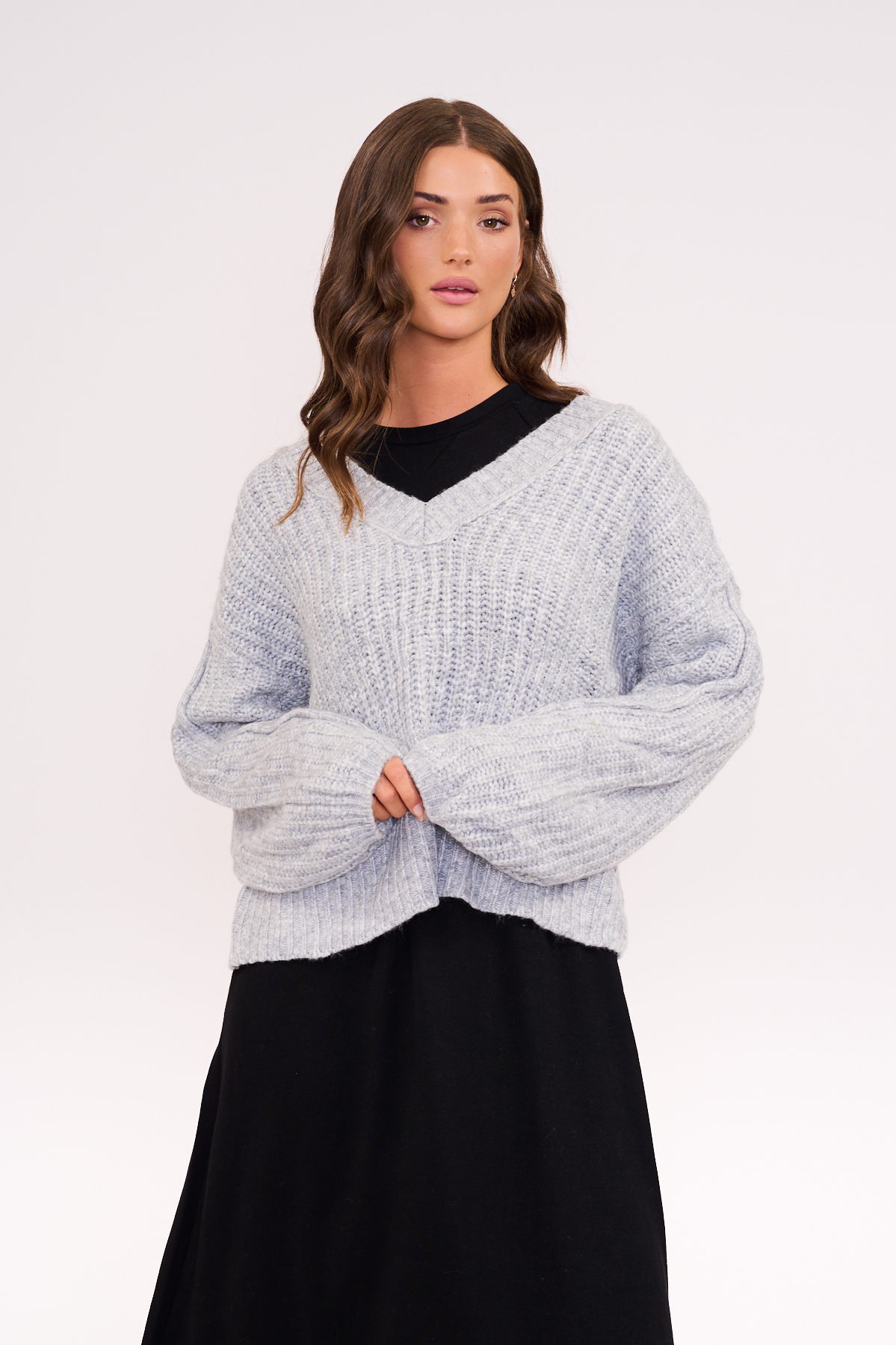 סריג בגזרת אוברסייז קלילה עם מפתח V מחמיא וסריגה במרקם עשיר ומלטף.