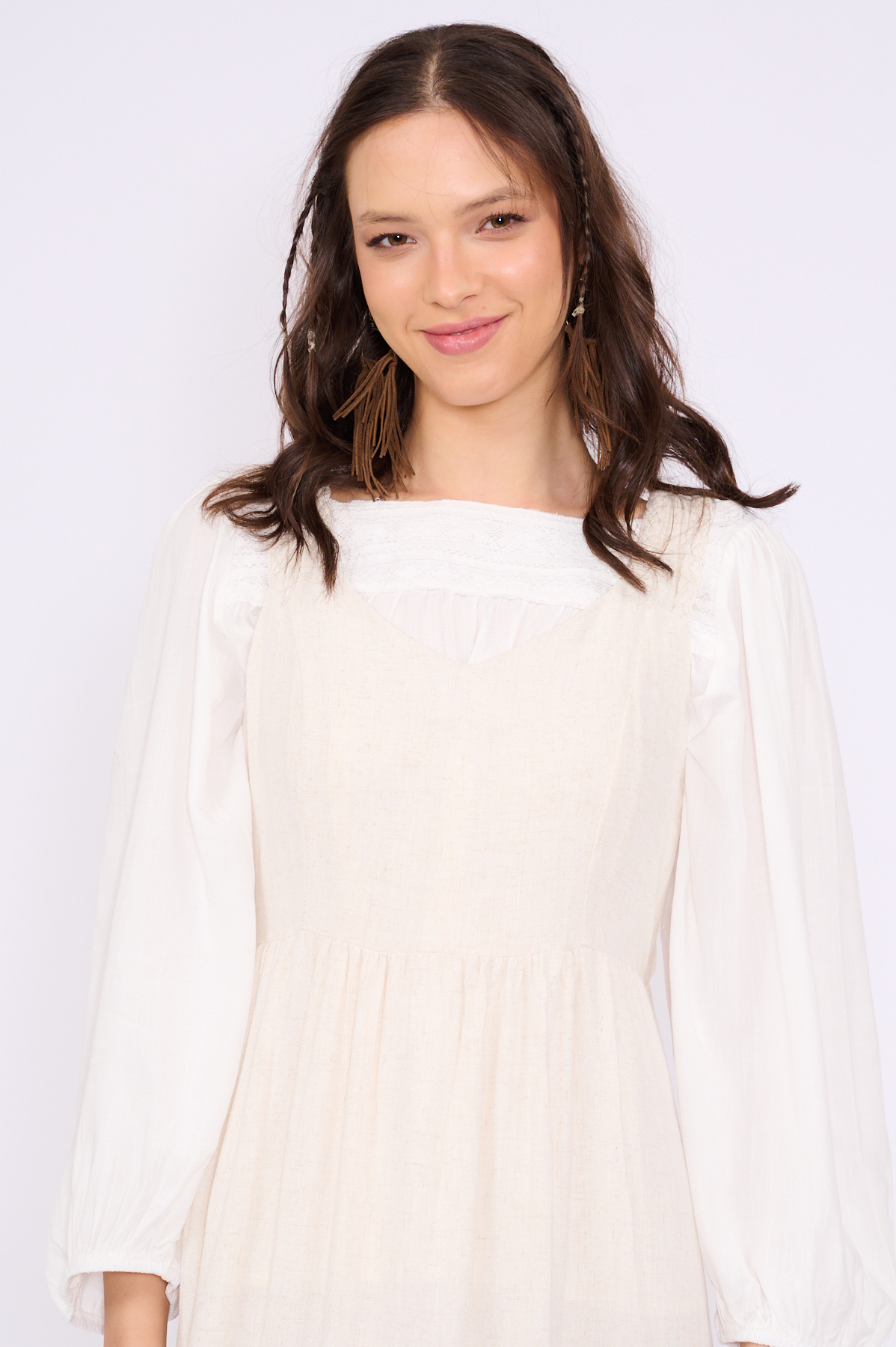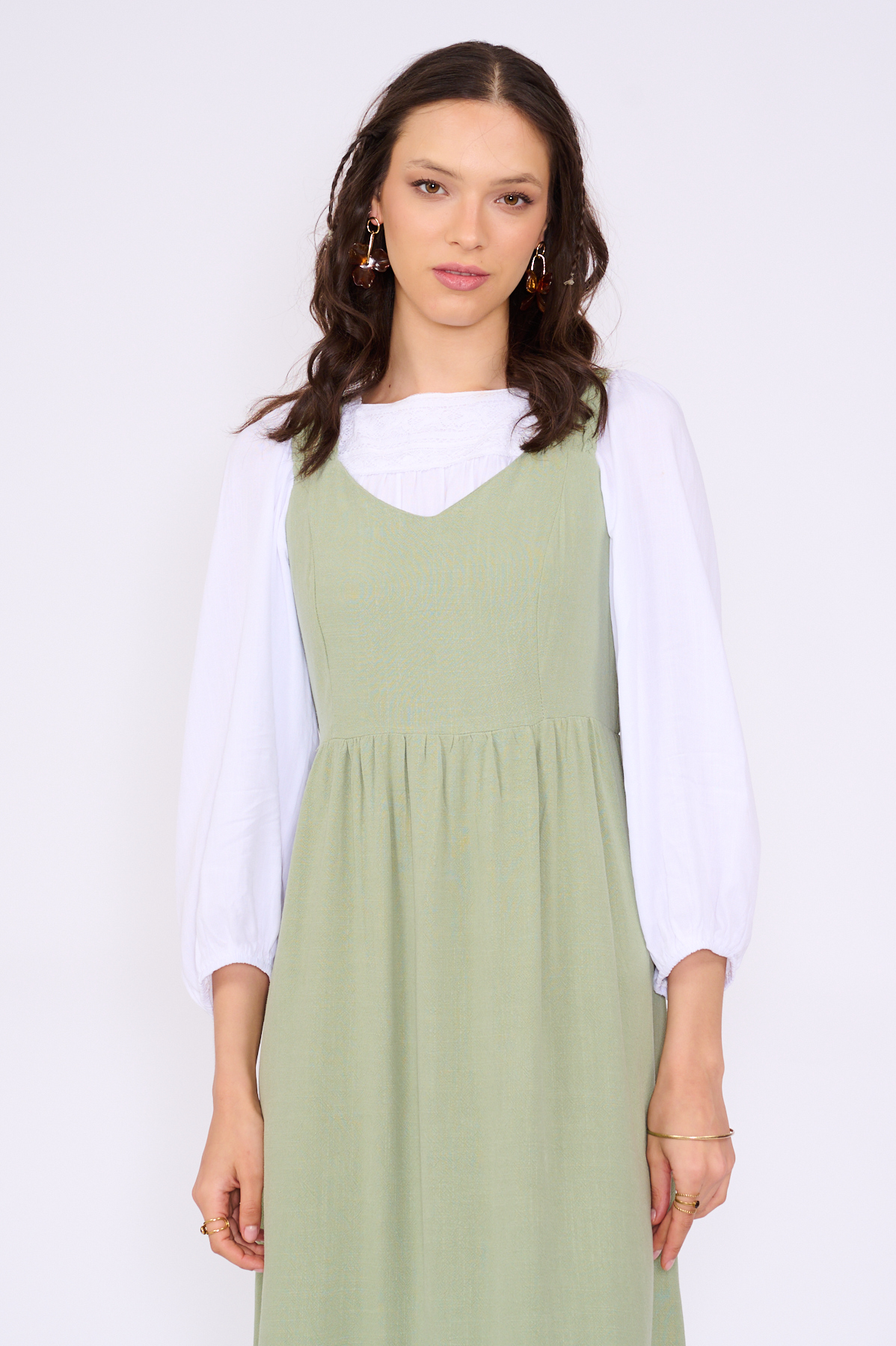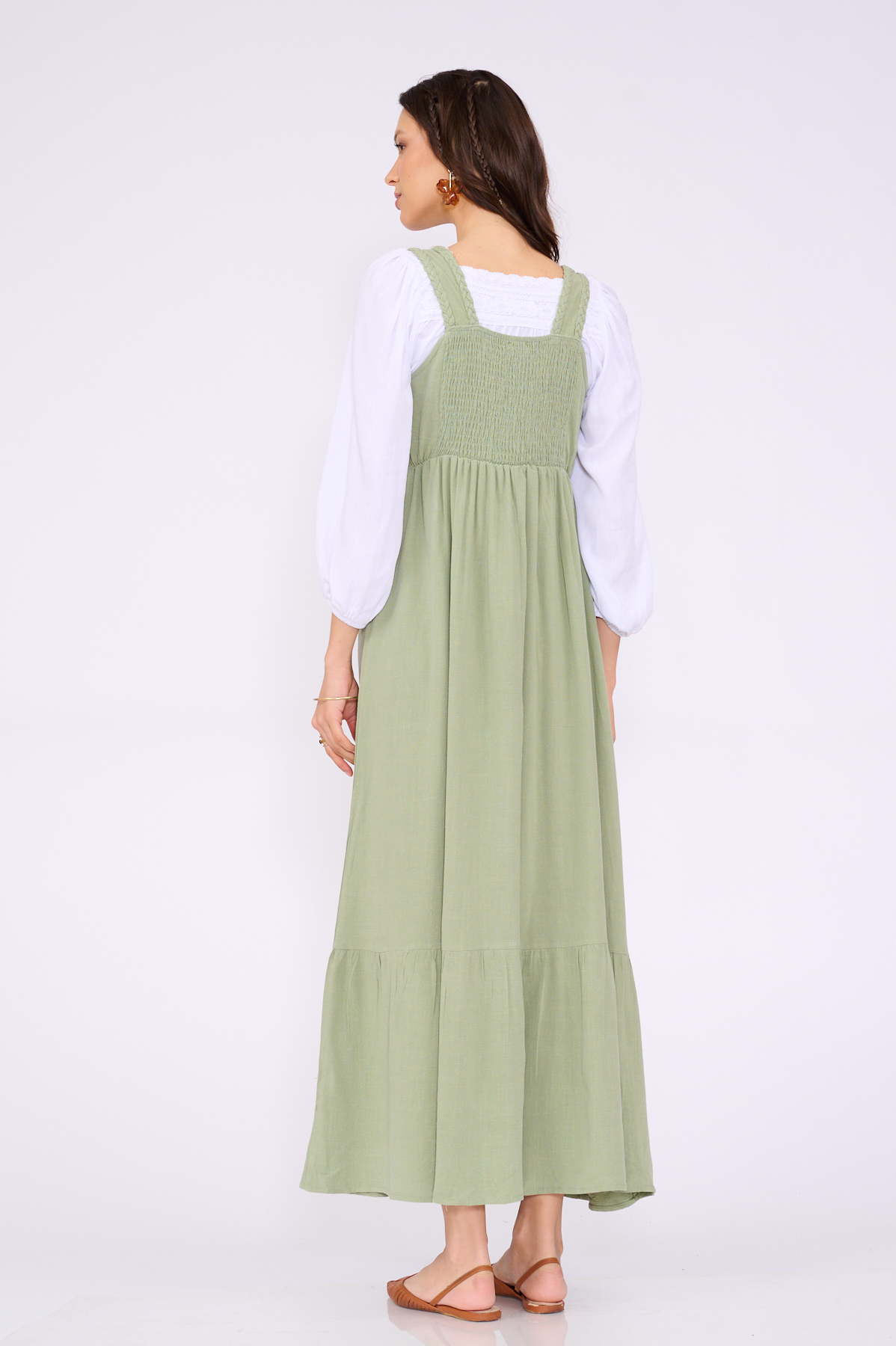 בגב יש כיווצים, חיתוך במותן וקומת וולן רחבה בסיומת השמלה,
