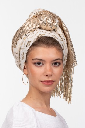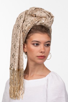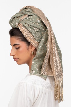צעיף עוצר נשימה במראה זוהר וחגיגי – שילוב מנצח של בד רקום בפרחים עדינים עם פאייטים מוזהבים, ולצידו סרט שימרי עשיר בפרנזים זהובים שמוסיפים תנועה וזוהר מרשים.