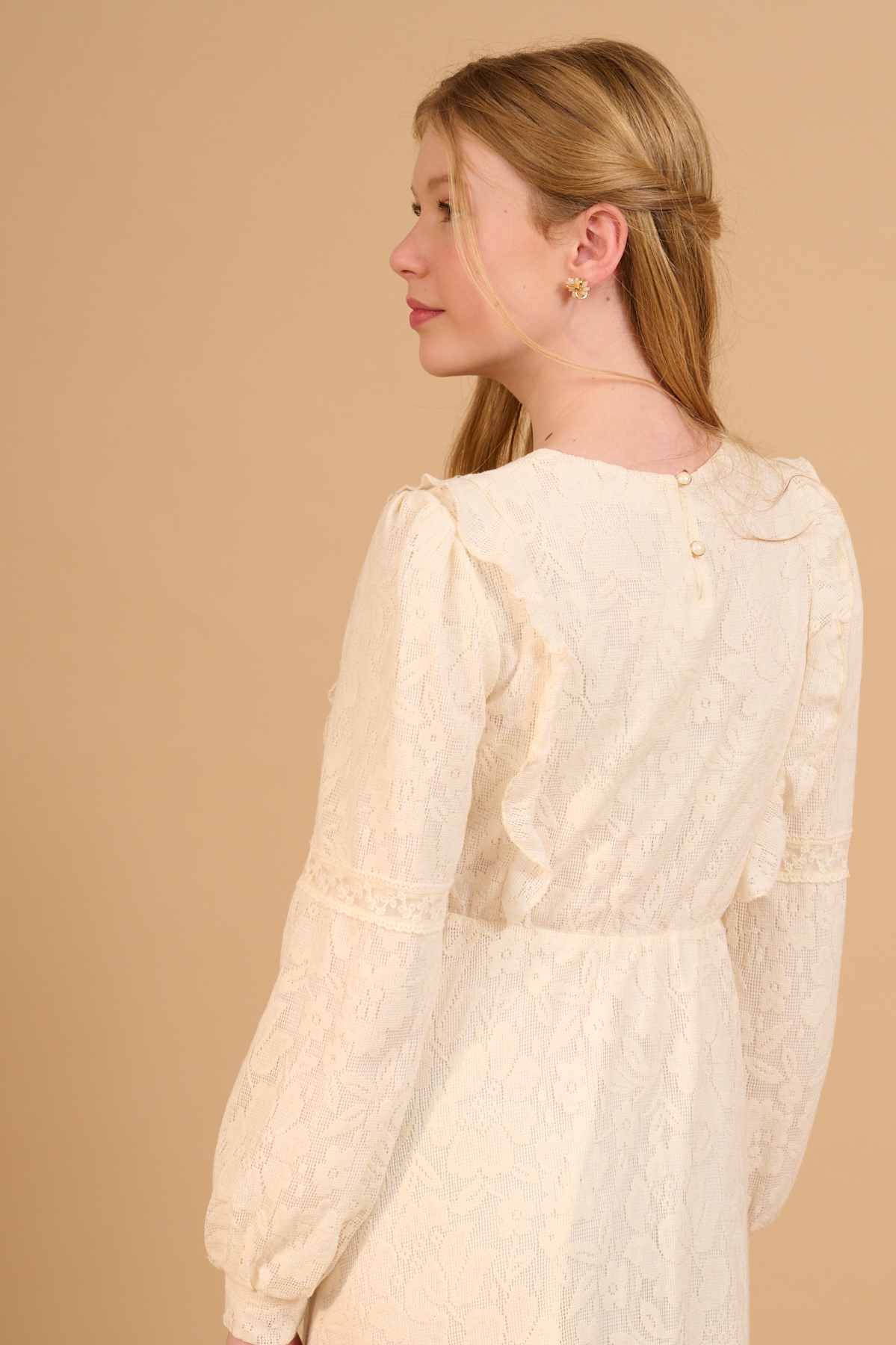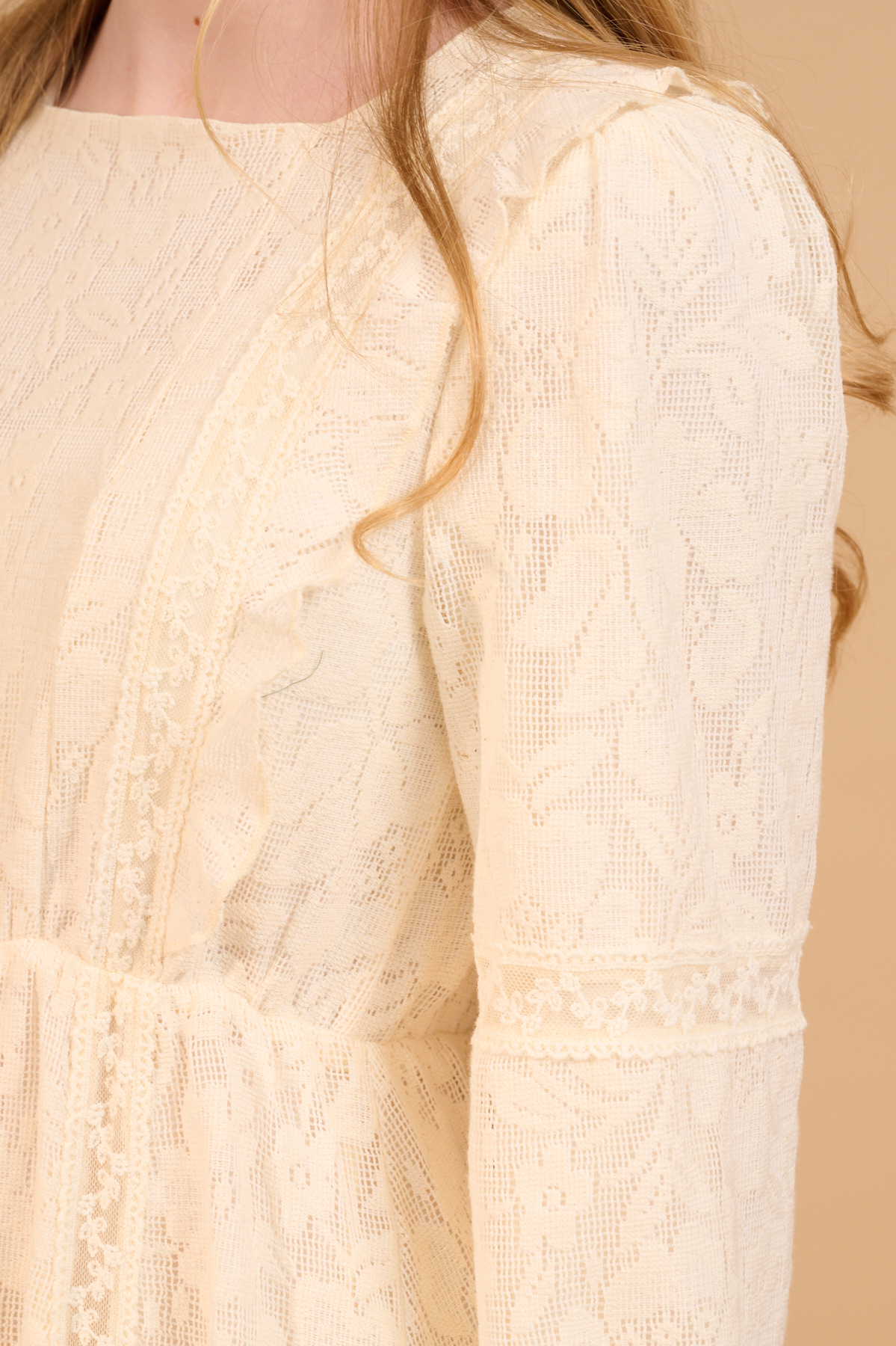 עשויה תחרה עשירה במראה פרחוני, עם שרוולים ארוכים ונפוחים וסיומת עדינה במפרק היד.