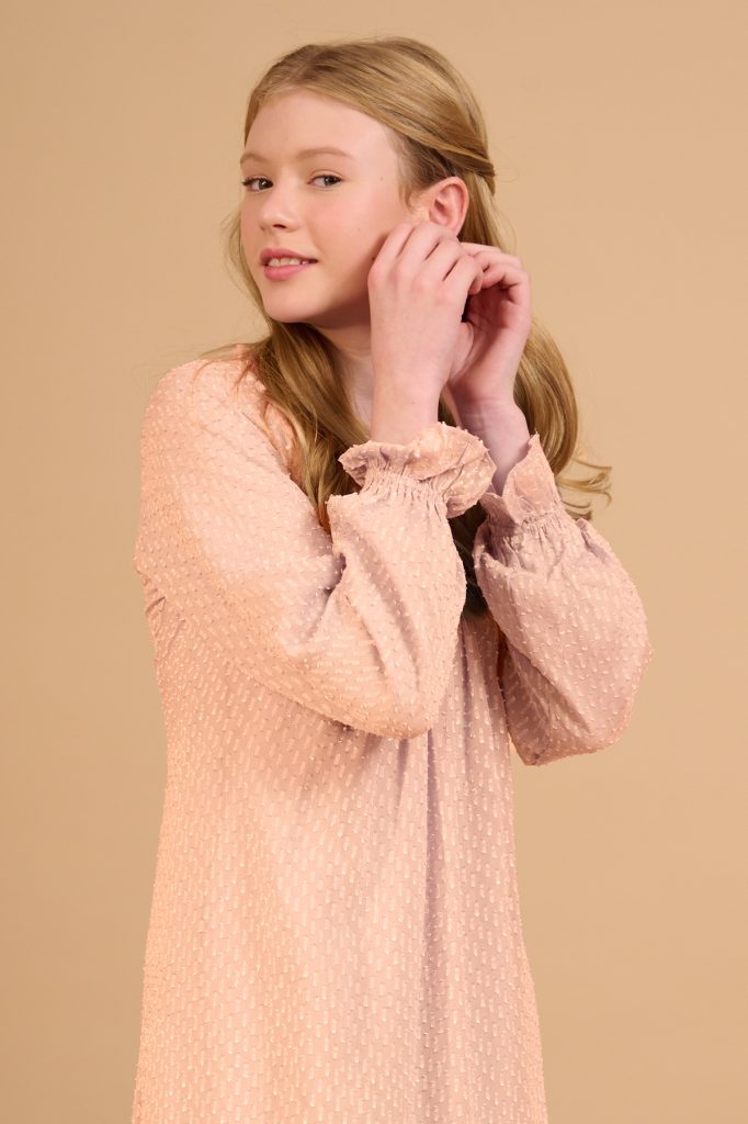 שרוולים ארוכים ונפוחים, וסיומת כיווצים נשית במפרק היד. הבד הנוצץ מוסיף טאץ’ חגיגי ועדין – כזה שמאיר כל הופעה באור רך וקסום.