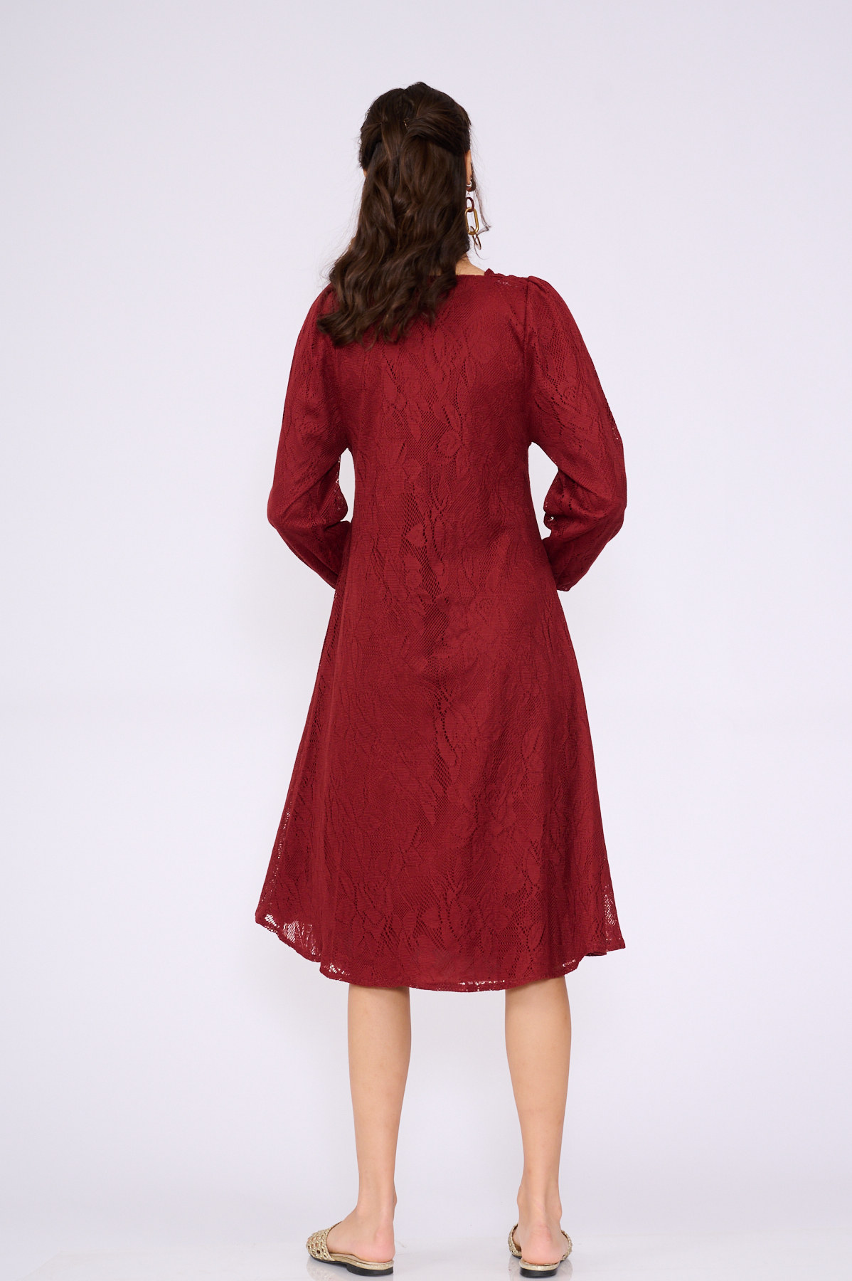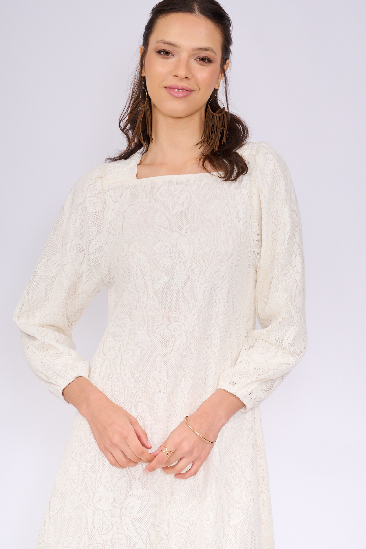 שמלת תחרה מושלמת! גזרה קלאסית עם מחשוף ריבוע מחמיא ושרוולים ארוכים ונפוחים מעט. עשויה מבד תחרה עשיר ואיכותי בדוגמה פרחונית מרגשת