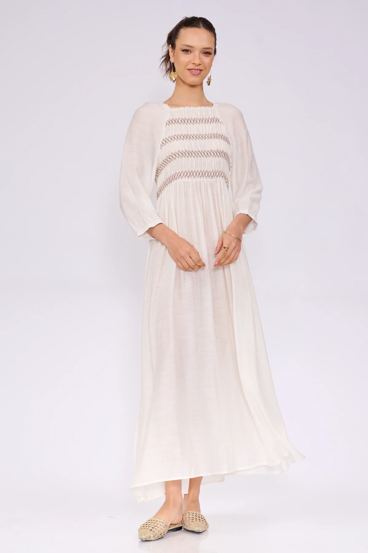 שמלת מקסי בגוון לבן-שמנת המשלבת פשטות ודיוק. השמלה עשויה מבד טבעי ואיכותי המעניק לה נפילה רכה לצד מראה אותנטי ונושם. הדיטייל המרכזי הוא עבודת ה”סמוק” (כיווצים) בחזית, המעוטרת ברקמה עדינה בגווני אדמה למראה אצילי וטבעי. השמלה בעלת גזרה משוחררת ומחמיאה, שרוולים ארוכים עם סיומת גומי עדינה וצניעות כהלכה.