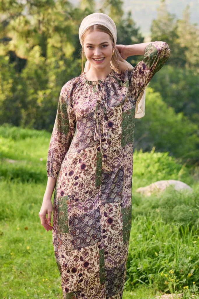לשמלה הדפס אתני עשיר וצבעוני, עם מפתח צוואר מעוטר בכיווצים עדינים וקשירת שרוכים שמוסיפים טאץ’ ייחודי