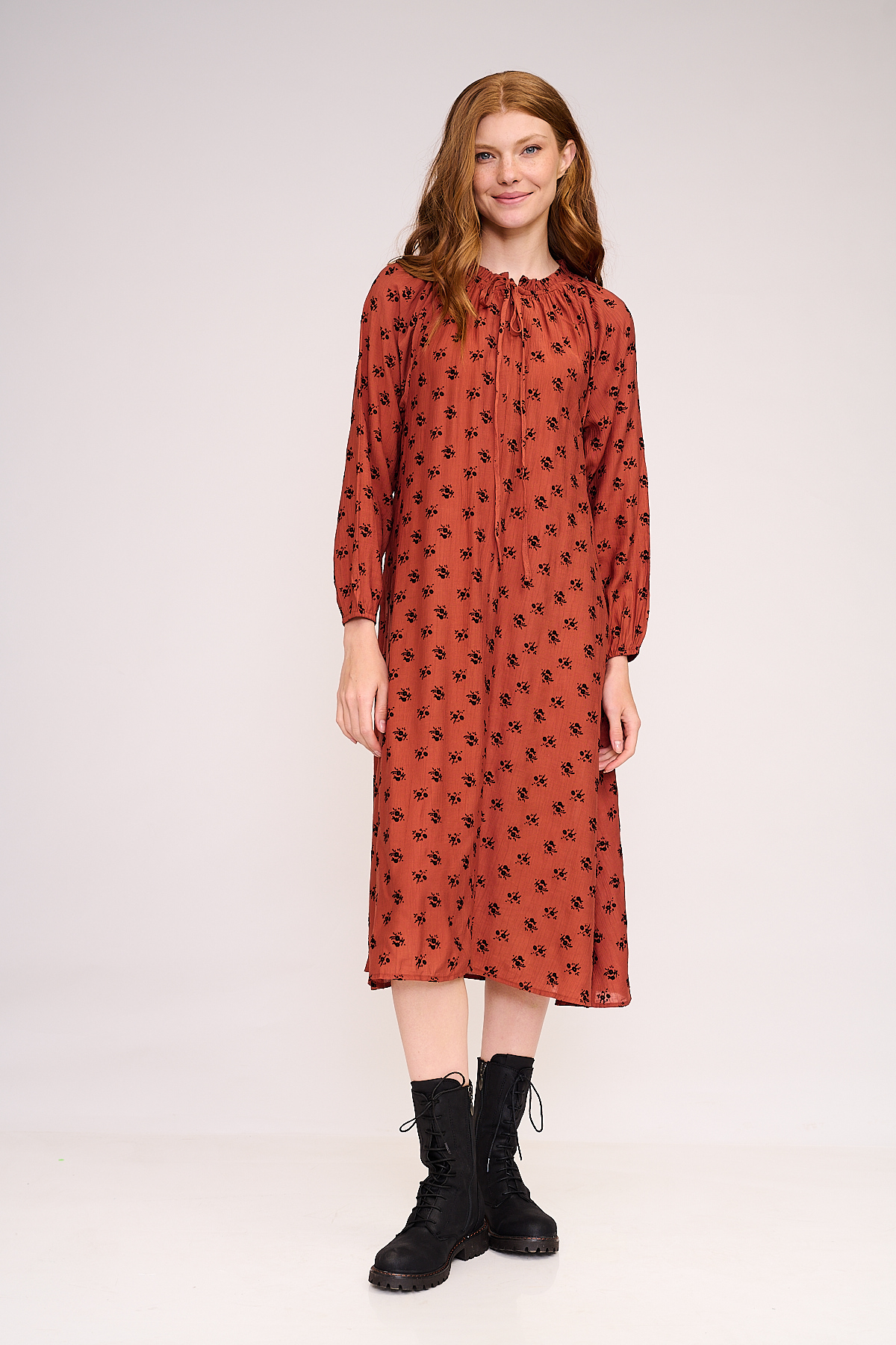 השמלה כוללת שרוולים ארוכים עם גומי עדין בקצה, מפתח עגול עם כיווצים עדינים, ורוכסן קדמי נסתר לנוחות מירבית.