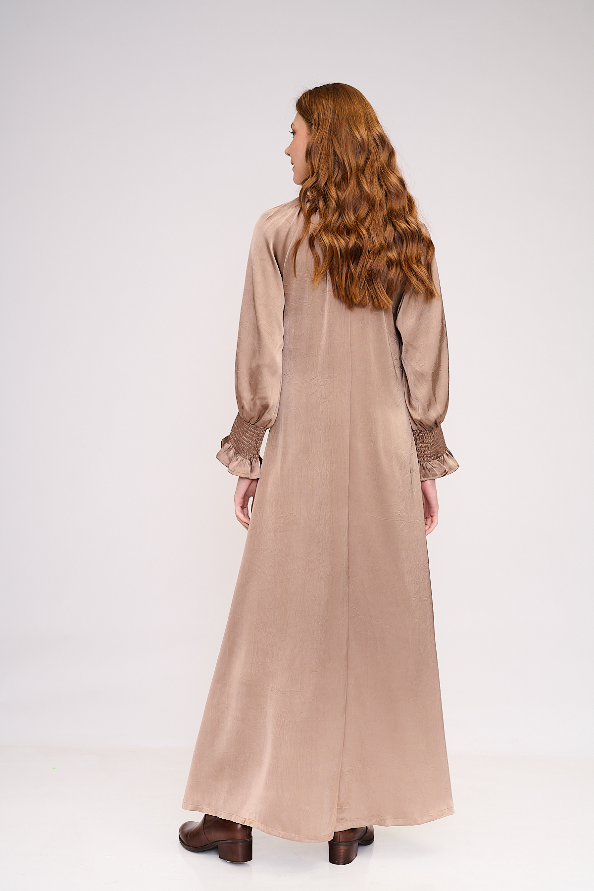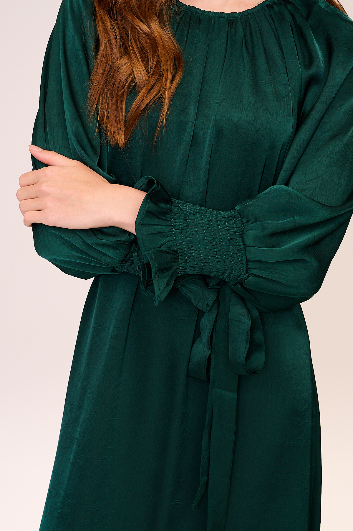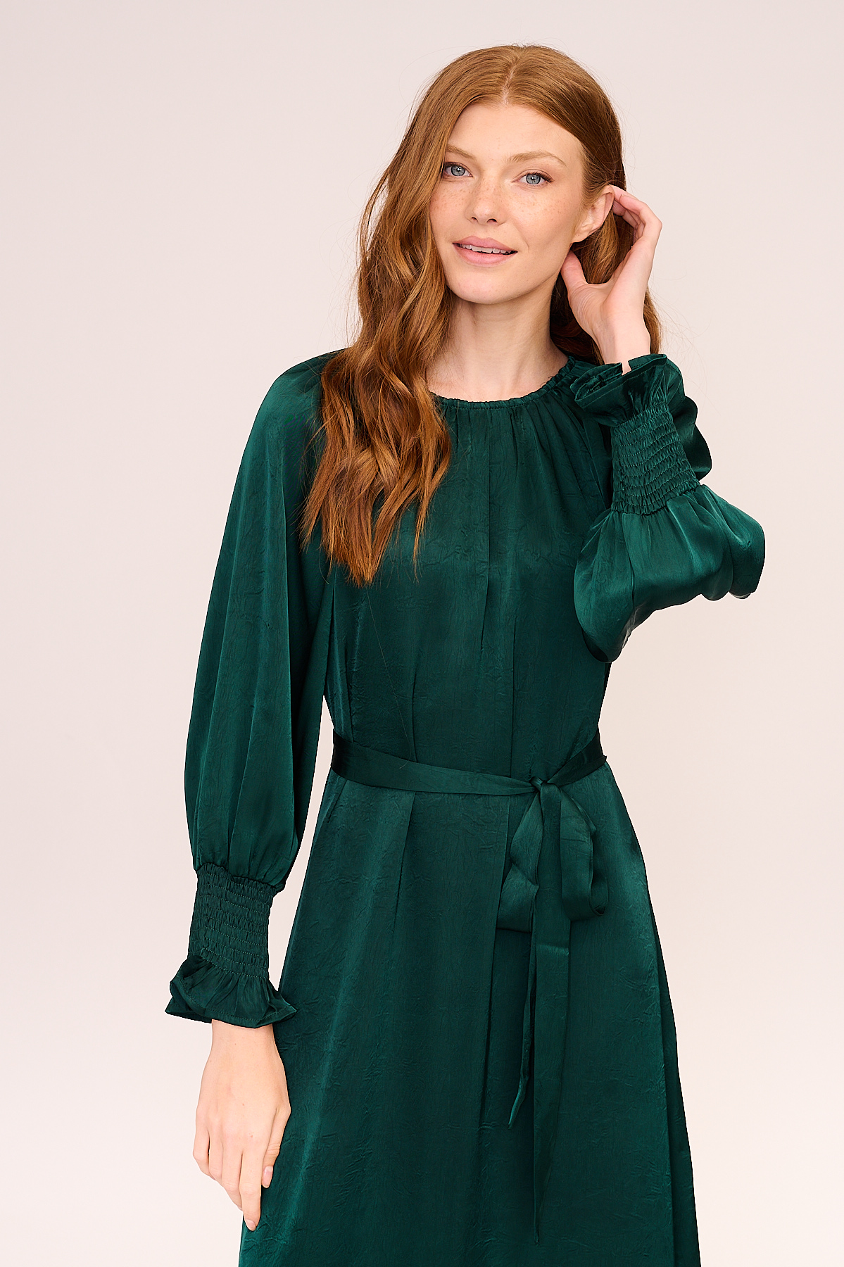 עשויה מ־100% פוליאסטר, בעלת מגע רך ונשפך שמעניק לגוף תחושה זורמת ונינוחה. הגזרה הארוכה והשרוולים המעוצבים עם סיומת מעודנת של גומי ושוליים רכים – מוסיפים נגיעה ייחודית ומלאת סטייל. חגורת הבד (בצבע הירוק) מאפשרת משחקי קשירה להדגשת המותן וליצירת מראה מחמיא יותר.
