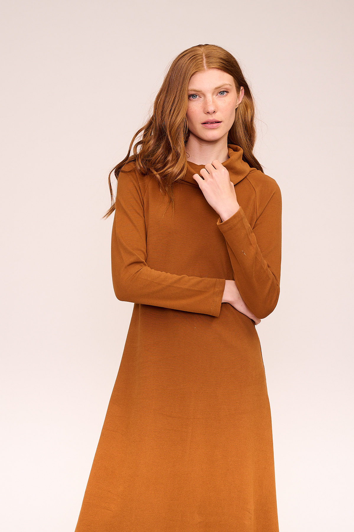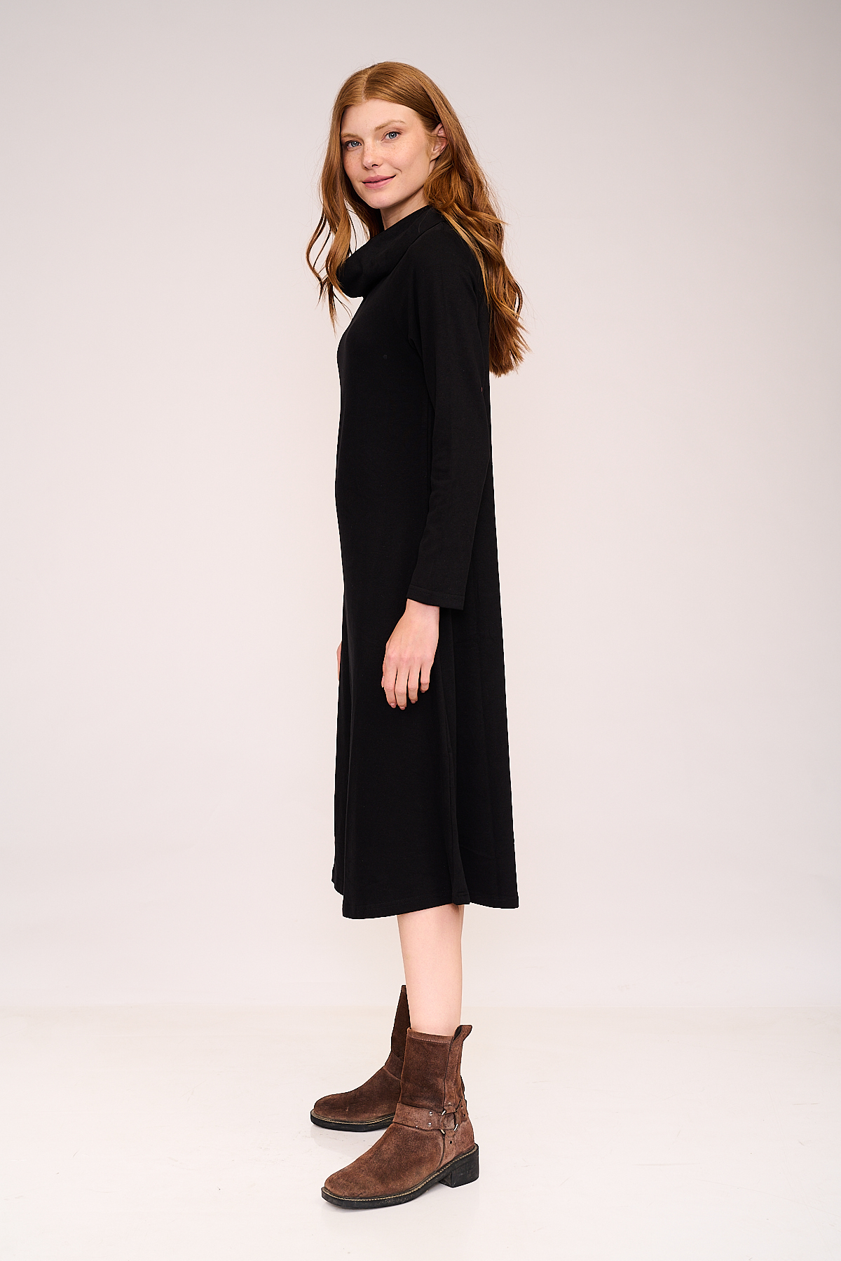 הגזרה הפשוטה והנקייה מדגישה את הקווים הנשיים בטבעיות, והצווארון הגבוה במראה רך מעניק לשמלה טאץ’ אלגנטי וחורפי.