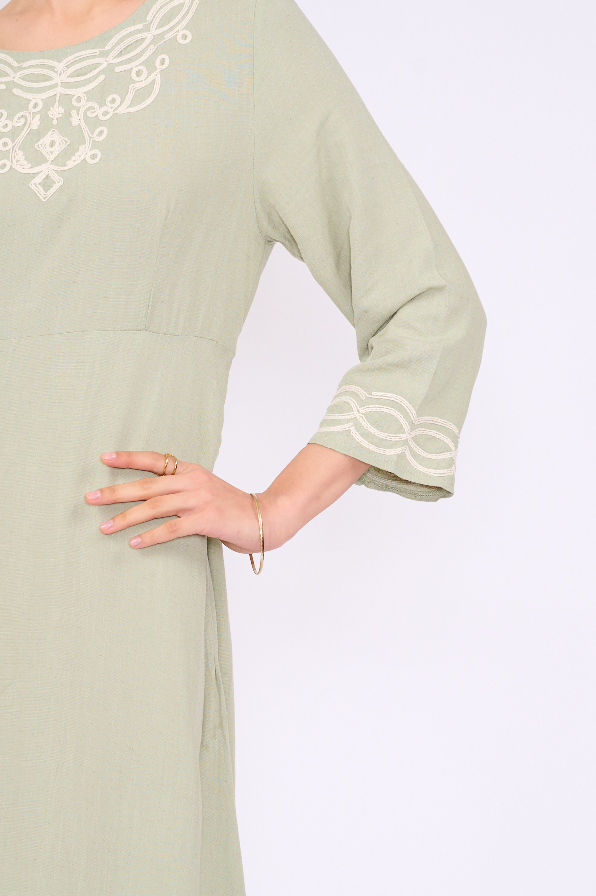 השמלה מתאפיינת בעיטורי רקמה לבנים סביב המחשוף העגול, בקצות השרוולים ובמכפלת התחתונה.