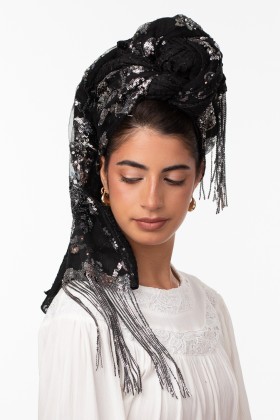 צעיף יוקרתי בעיצוב מלכותי – משלב רקמה עשירה, פאייטים מנצנצים ופרנזים מוזהבים שיוצרים מראה אלגנטי, בולט ומלא שיק.